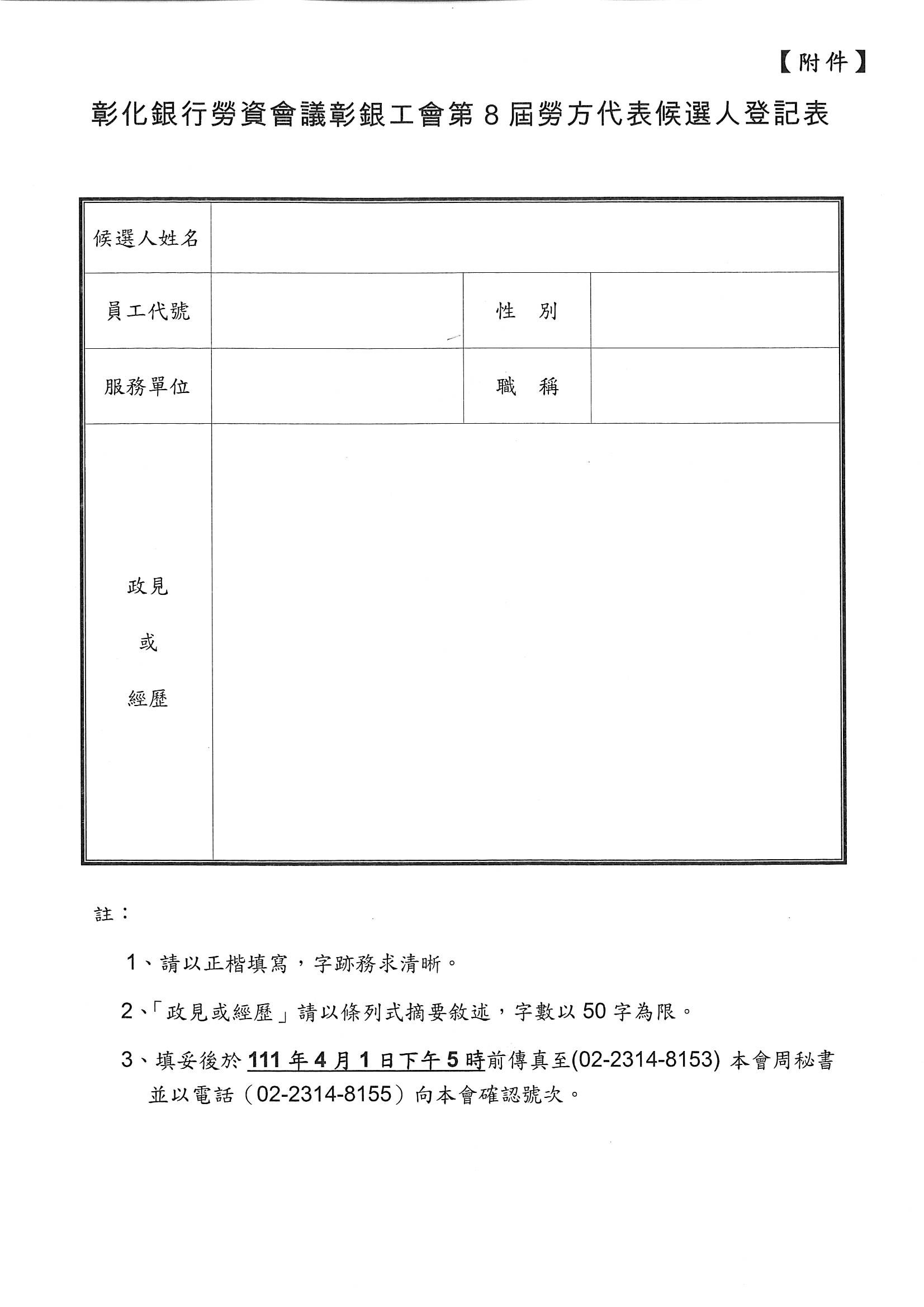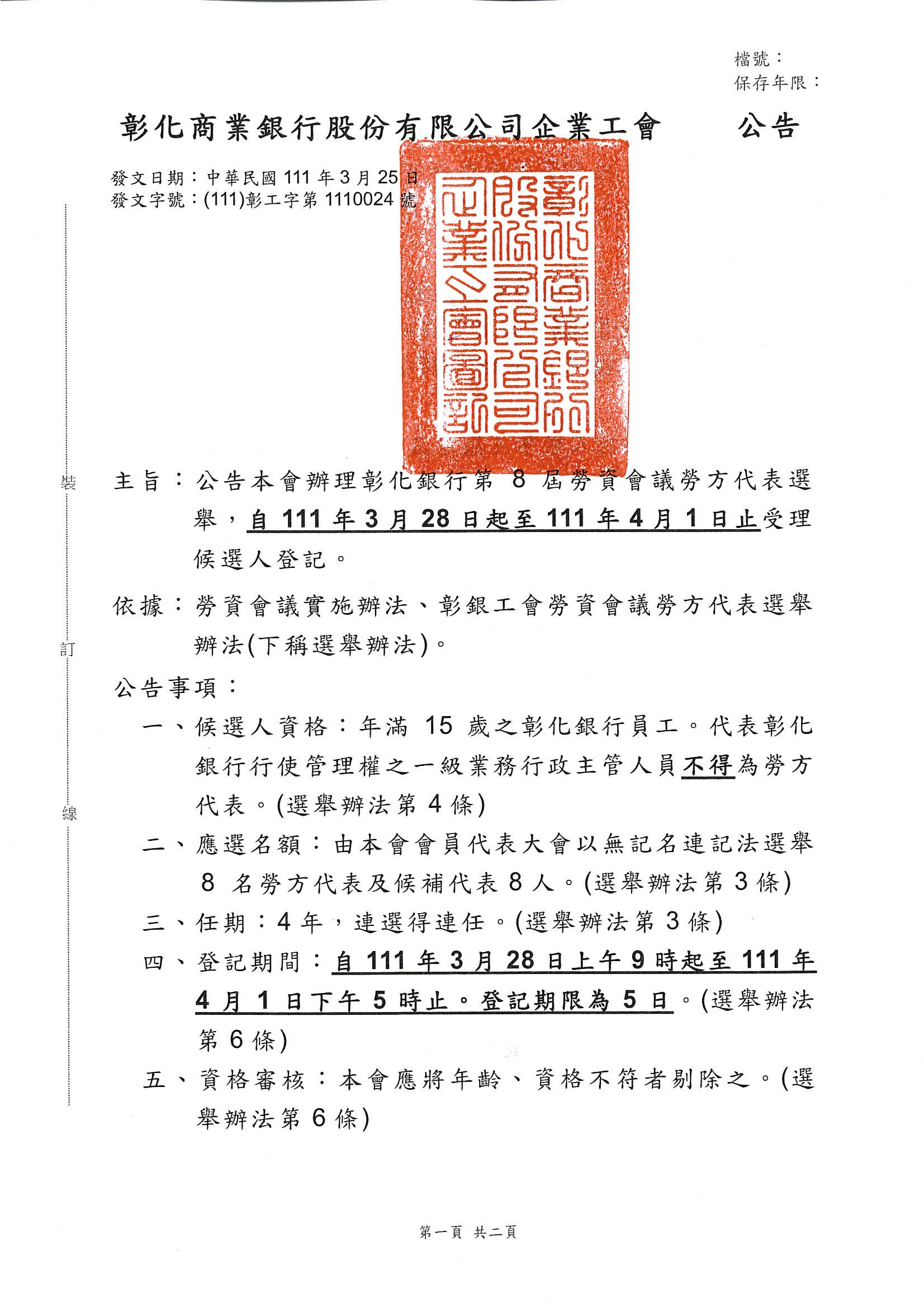 111.3.25彰銀工會公告--公告本會辦理彰化銀行第8屆勞資會議勞方代表選舉。