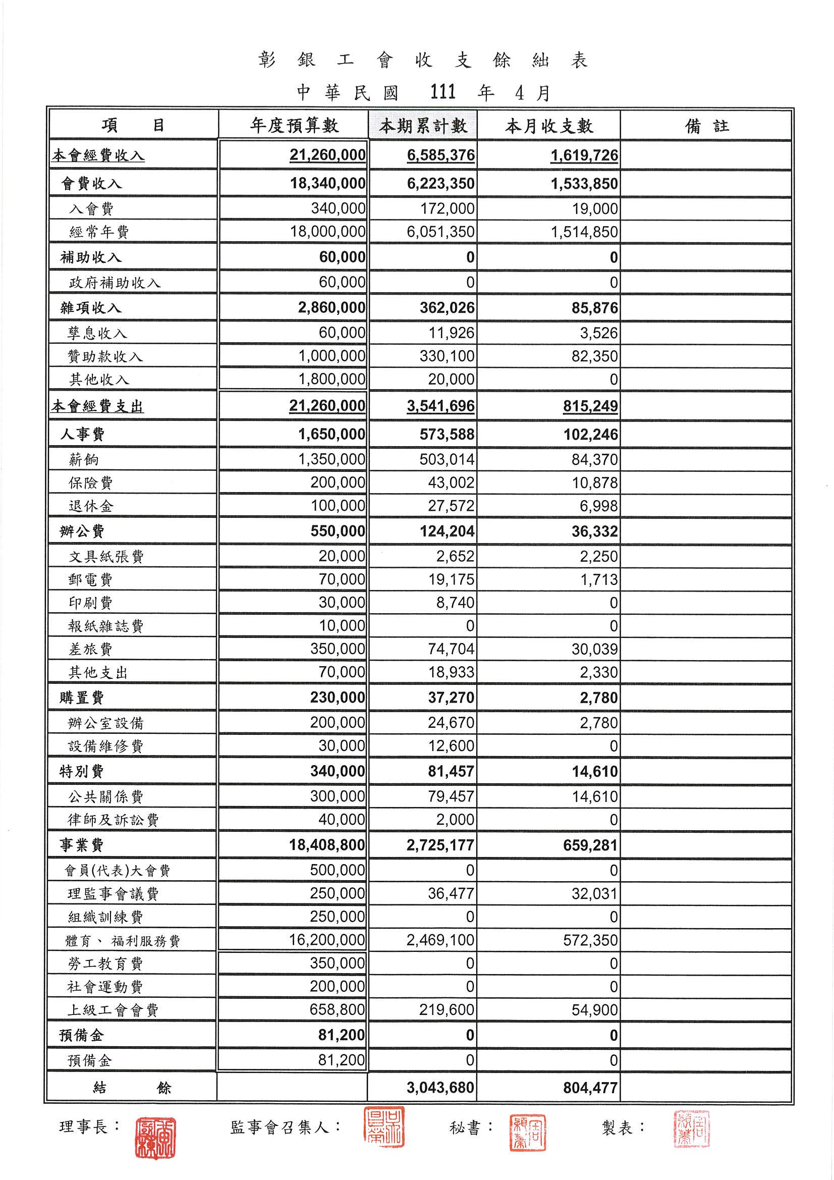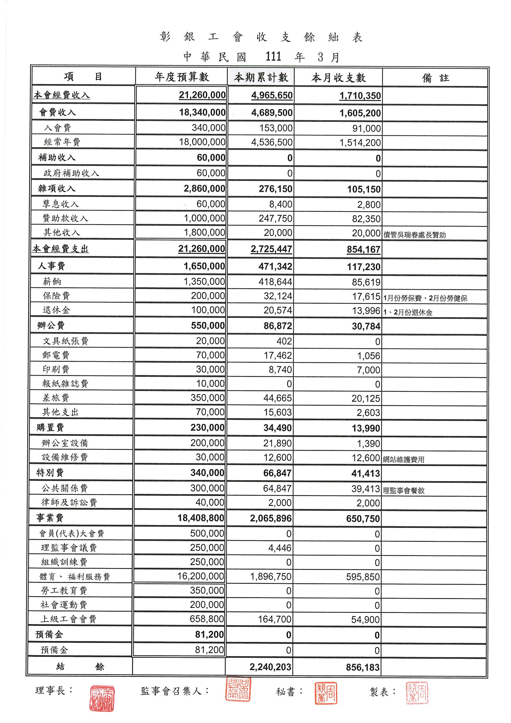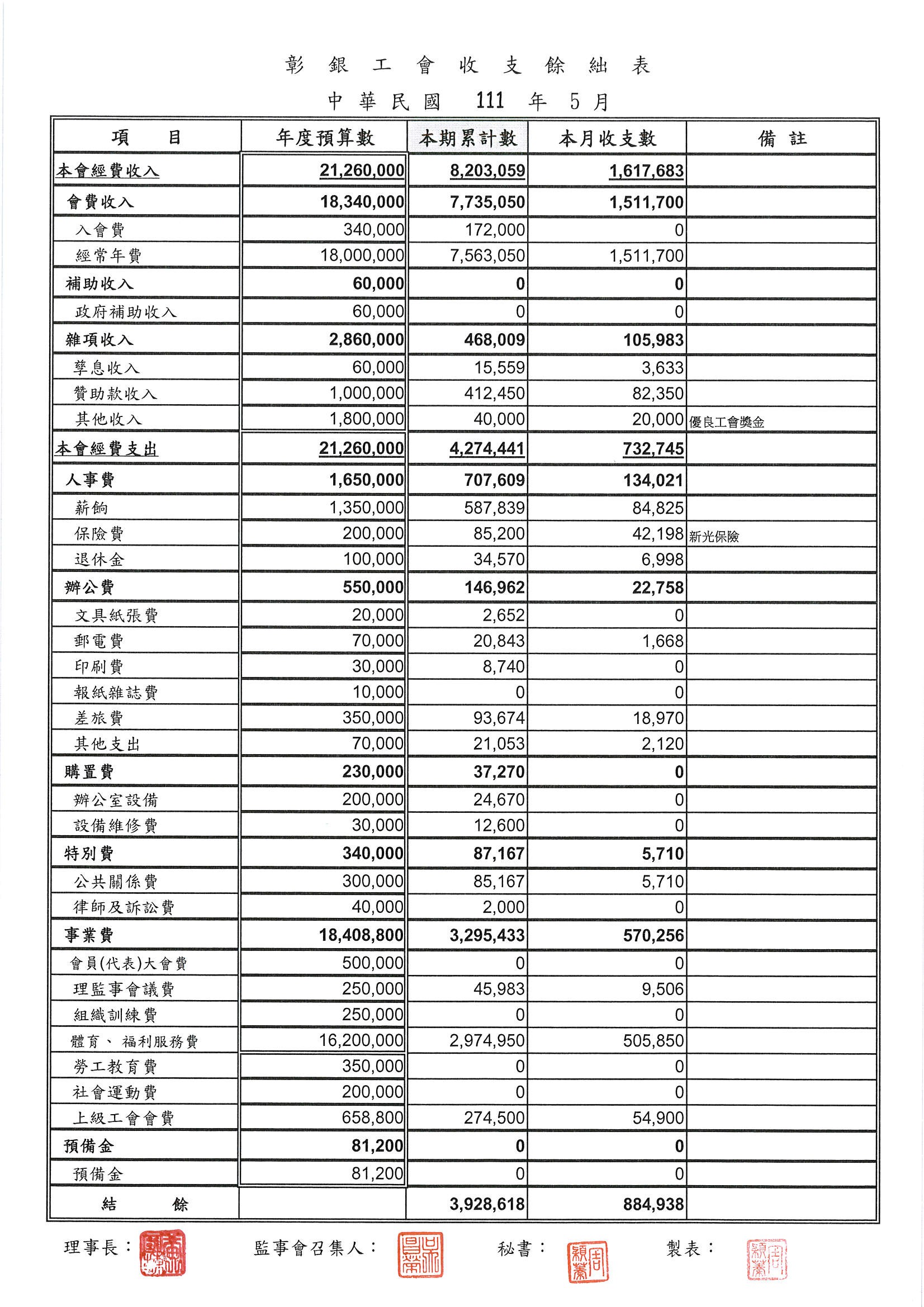 111年3月份至5月份收支餘絀表