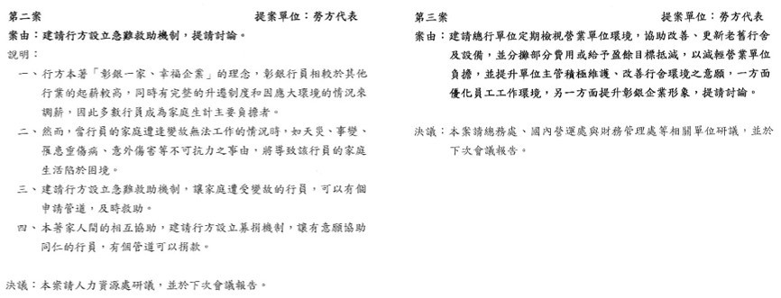 會務近況 第8屆第1次勞資會議工會向行方提出二個議案 發表時間 / 2022.10.18 第8屆第1次勞資會議已於9月20日召開,本會於會議中向行方提出二個議案如下。 經會議討論後,決議責由總行相關處室於下次會議報告,本會除持續追蹤、關注議題之進展,並期待獲得行方正面回應與積極作為。 回列表
