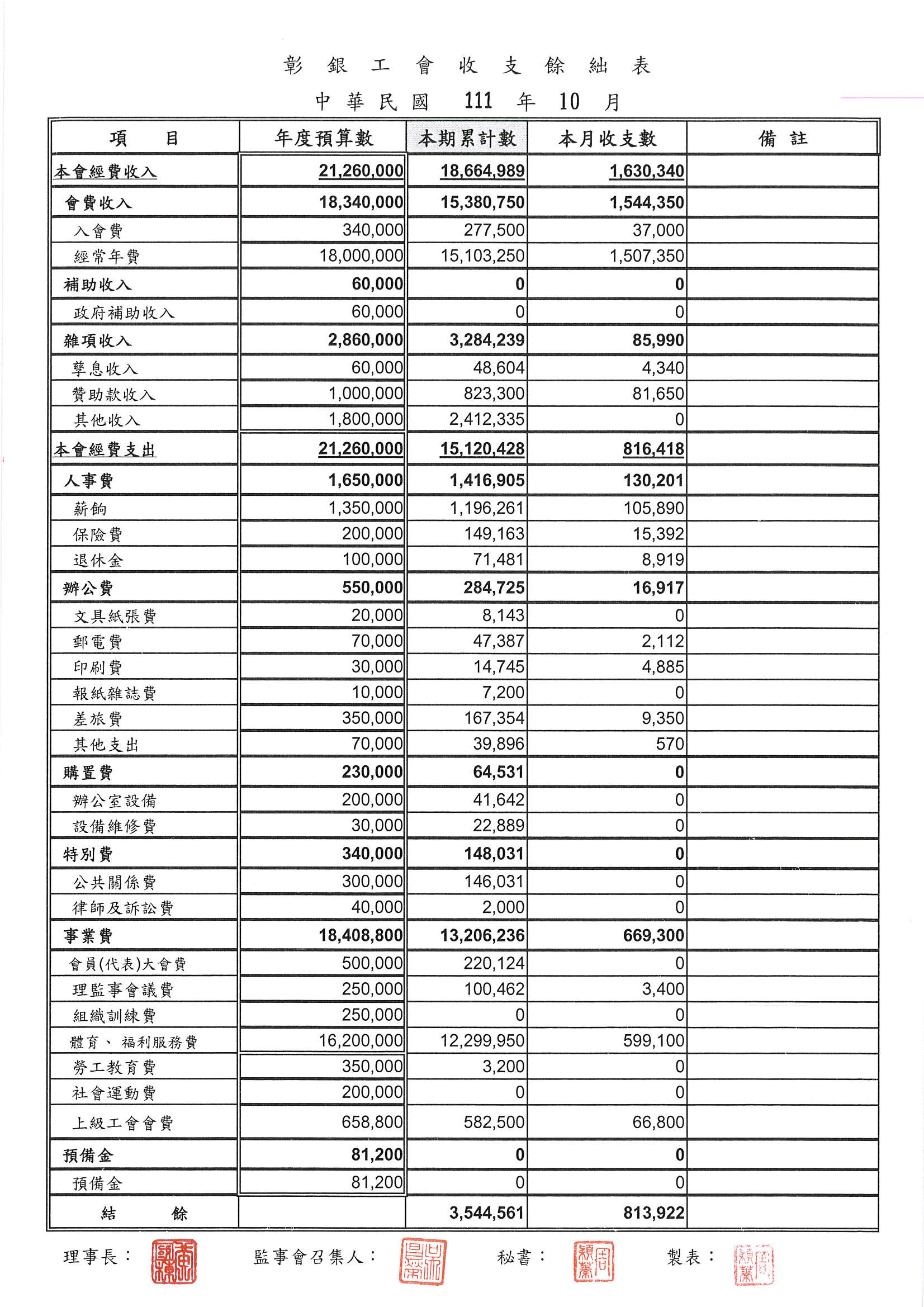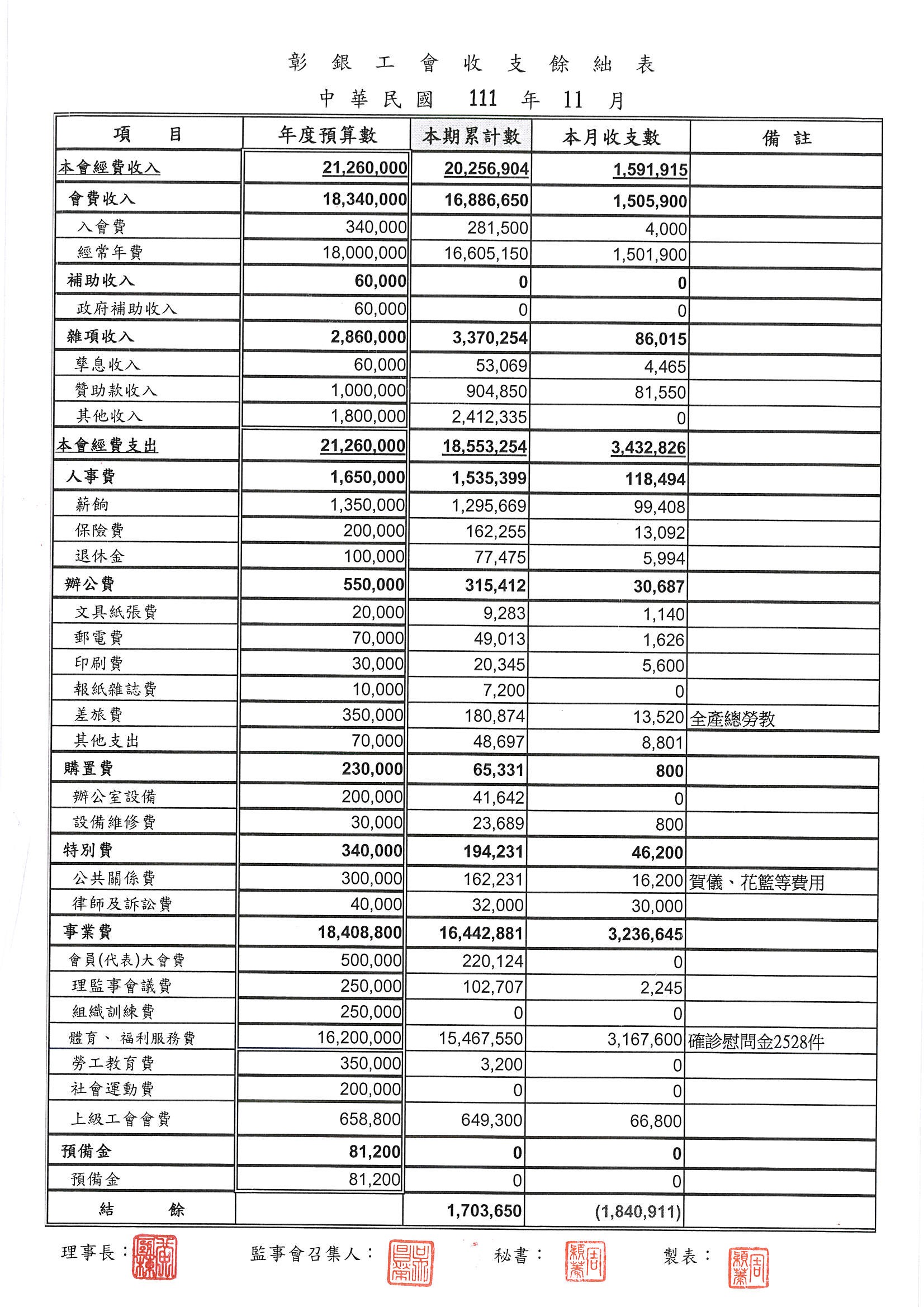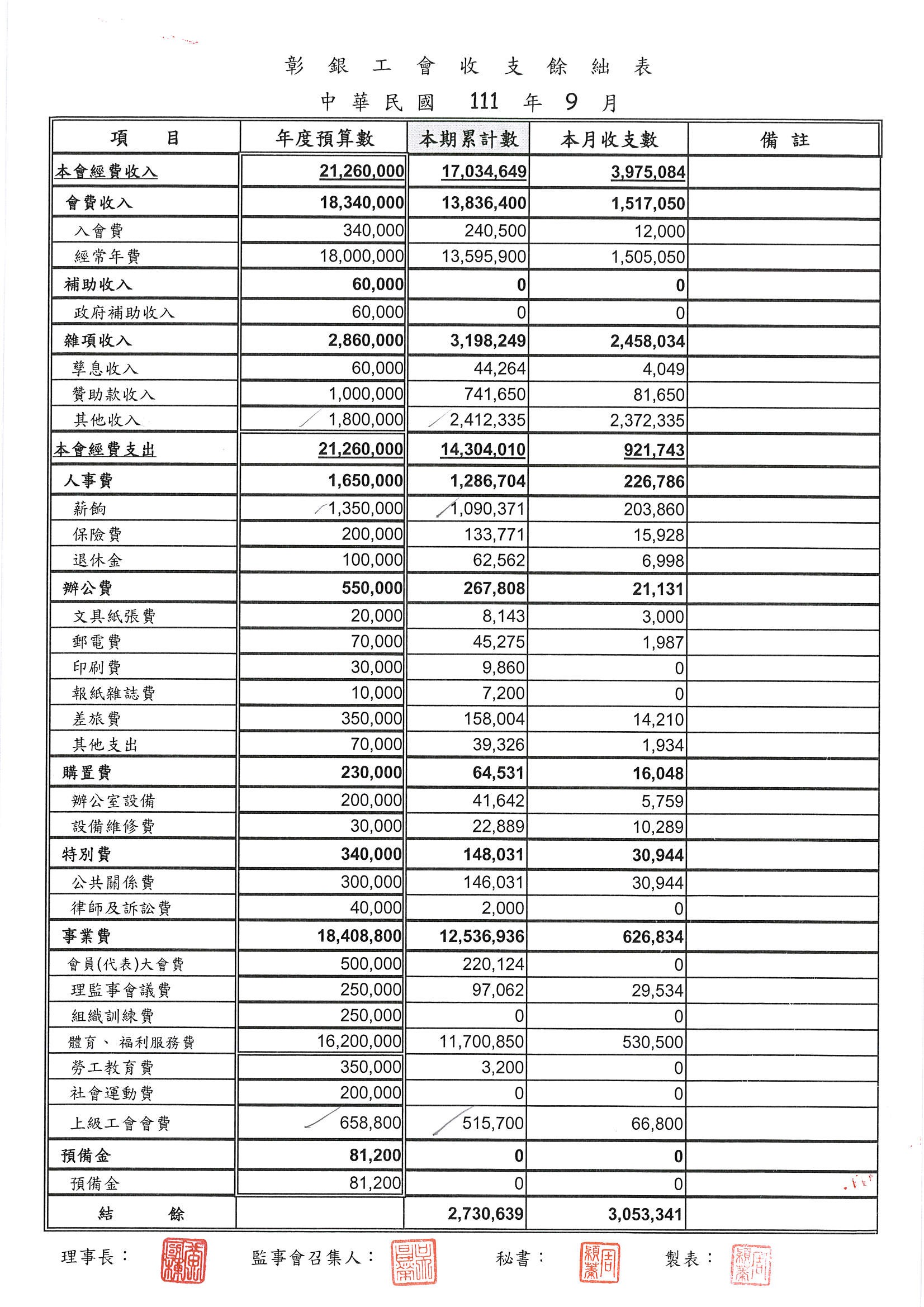 111年9月份至11月份收支餘絀表