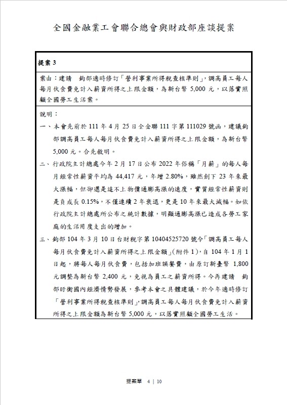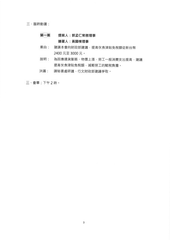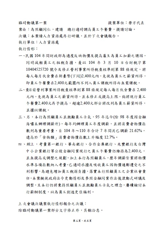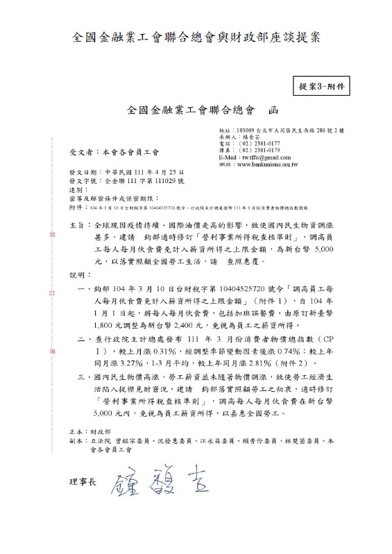 會務近況 爭取提高午餐費~ 發表時間 / 2023.03.27 針對爭取提高午餐費議題,本會已於勞資會議正式提案討論,爭取提高員工午餐費。 另,本會亦在全國產業總工會理事會議上連署該議案,爭取提高伙食津貼免稅額。 本會近期將與全國金融業工會聯合總會、拜會財政部莊部長,提案爭取提高員工每人每月伙食費免計薪資所得之上限金額為新台幣5,000元。 本會除持續追蹤、關注議題之進展,並期待獲得財政部正面回應與積極作為。 回列表