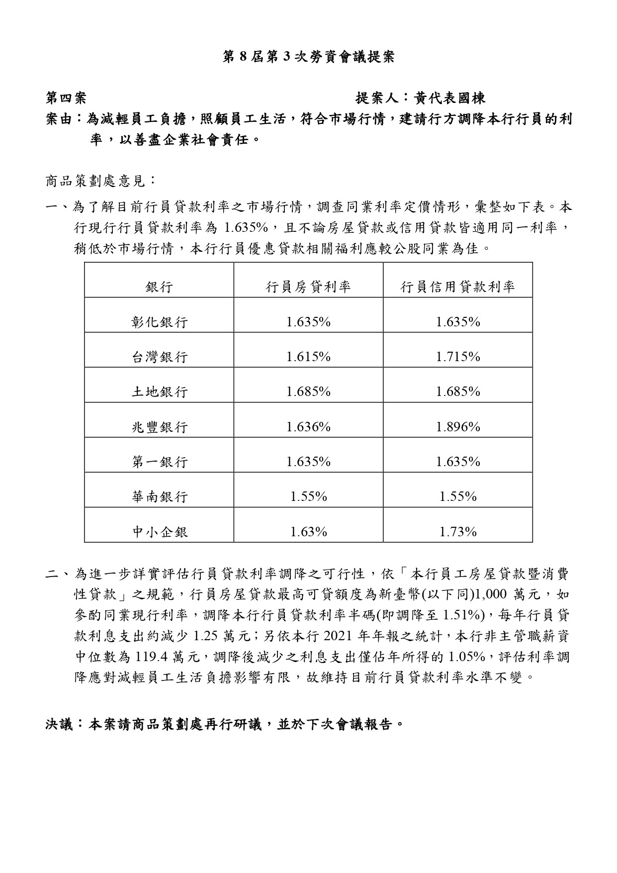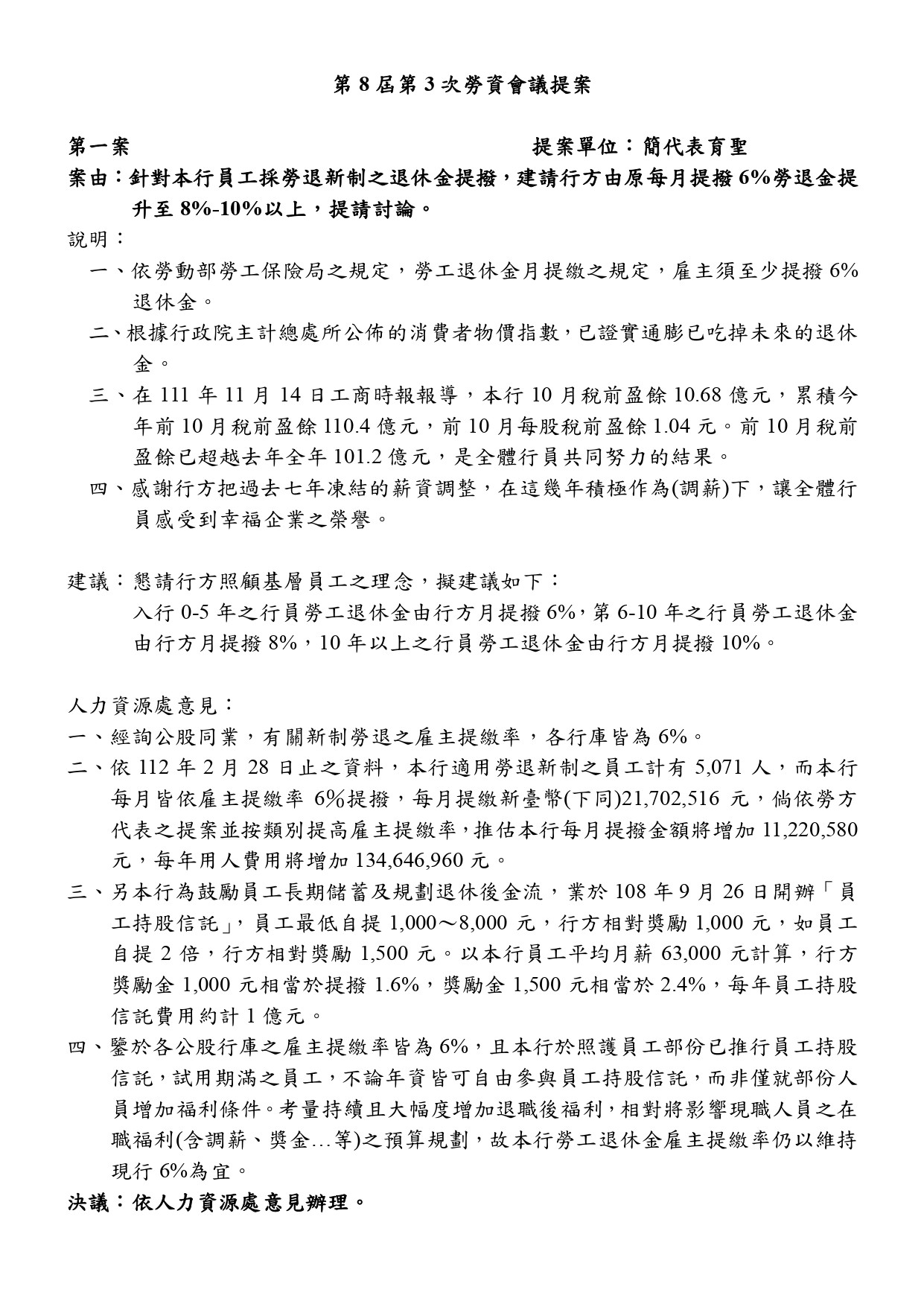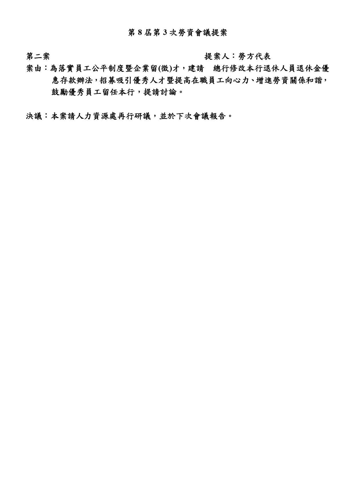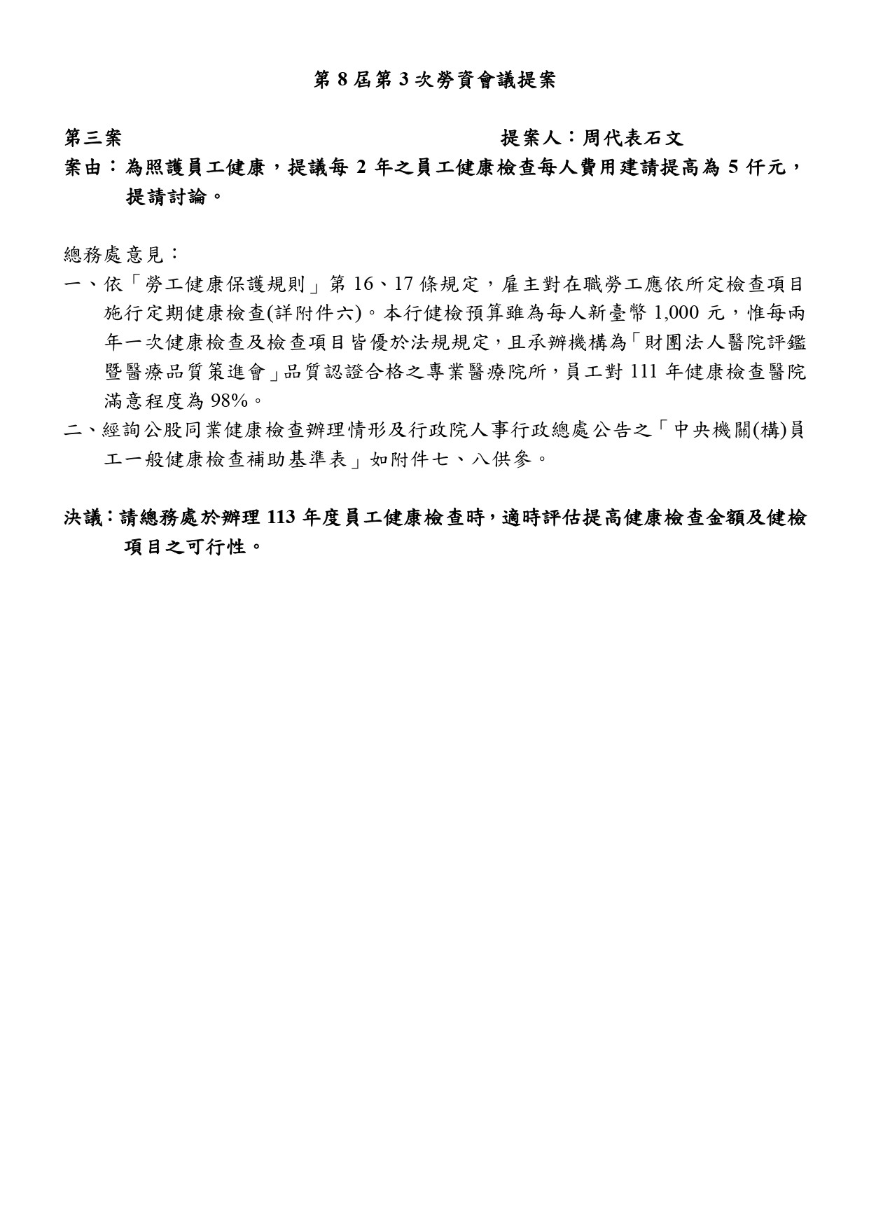 會務近況 第8屆第3次勞資會議提案 發表時間 / 2023.04.10 第8屆第3次勞資會議已於3月22日召開,代表們於會議中向行方提出議案如下: 經會議討論後,部分議題的決議於下次會議報告,本會除持續追蹤、關注議題之進展,並期待獲得行方正面回應與積極作為。 回列表