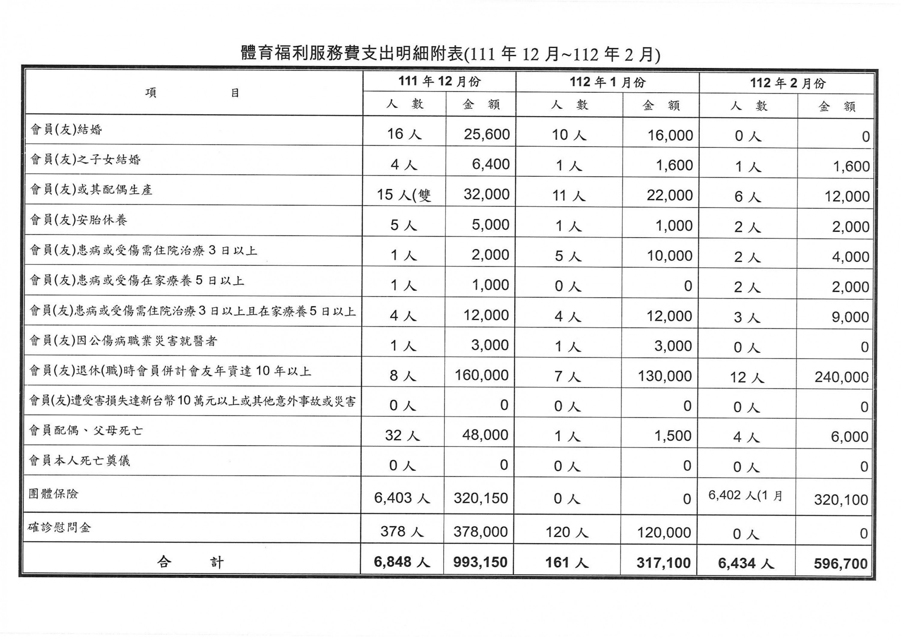 111年12月份至112年2月份體育、福利服務費用支出明細表