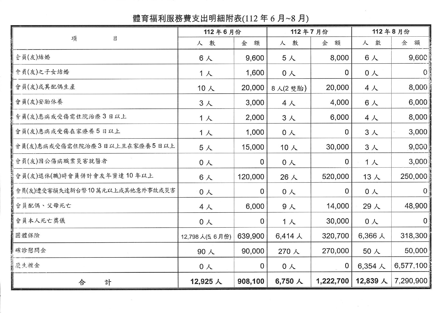 112年6月份至8月份體育、福利服務費用支出明細表