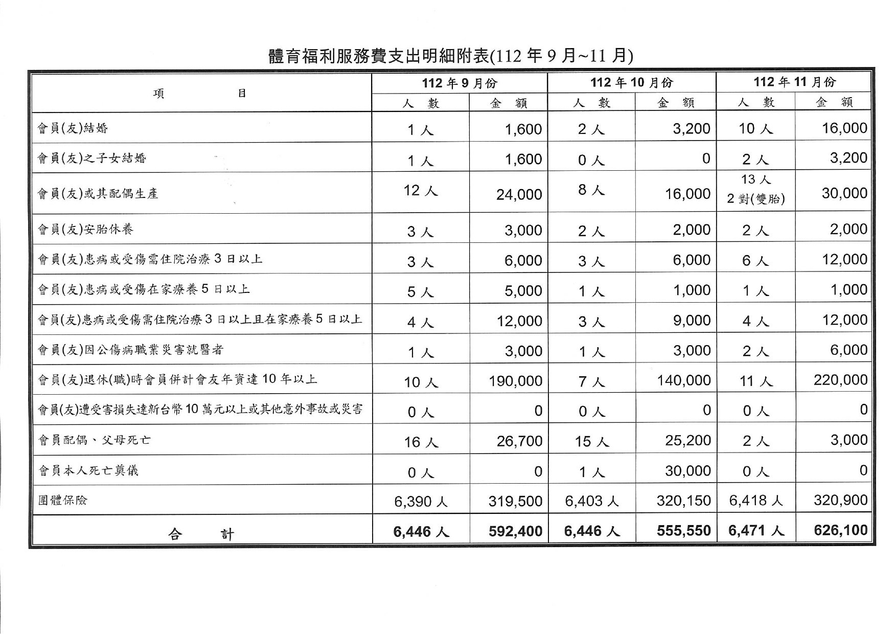 112年9月份至11月份體育、福利服務費用支出明細表