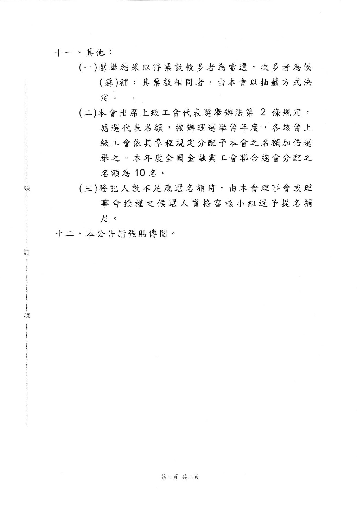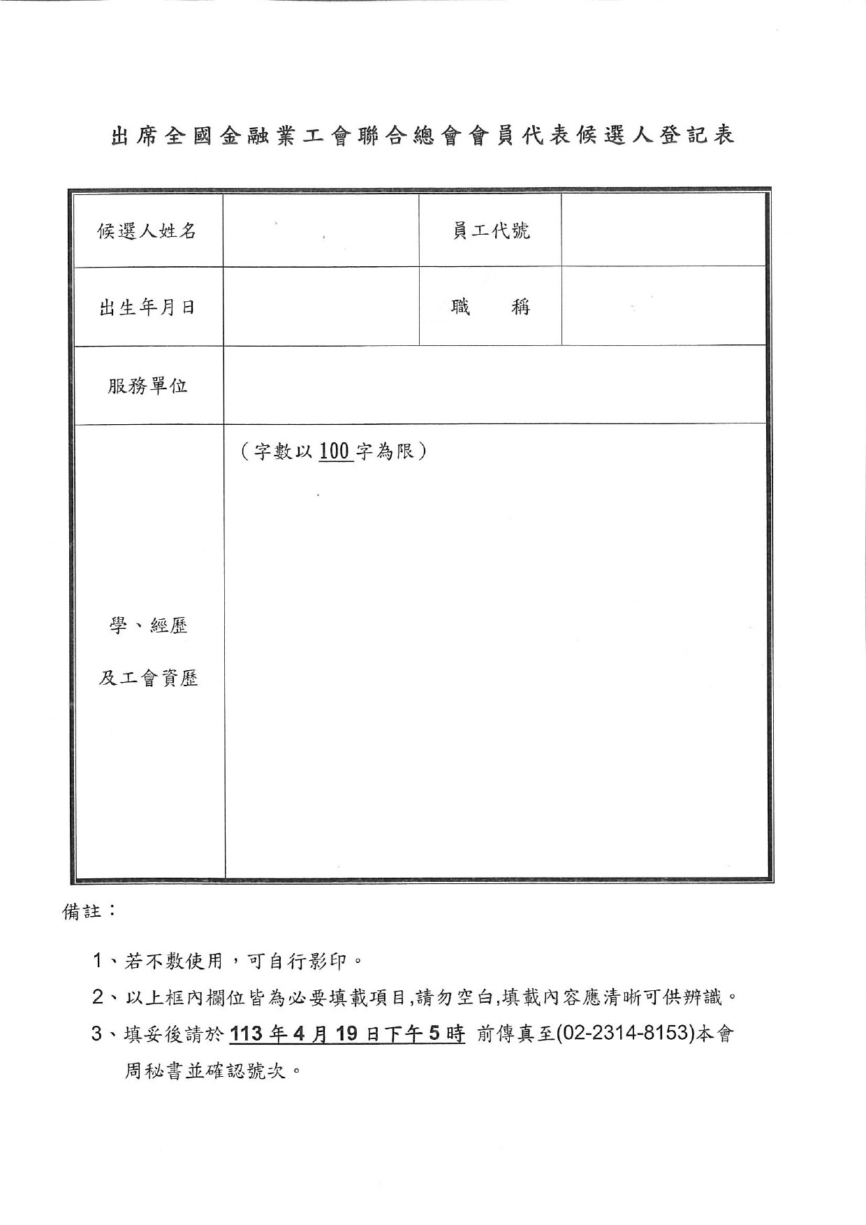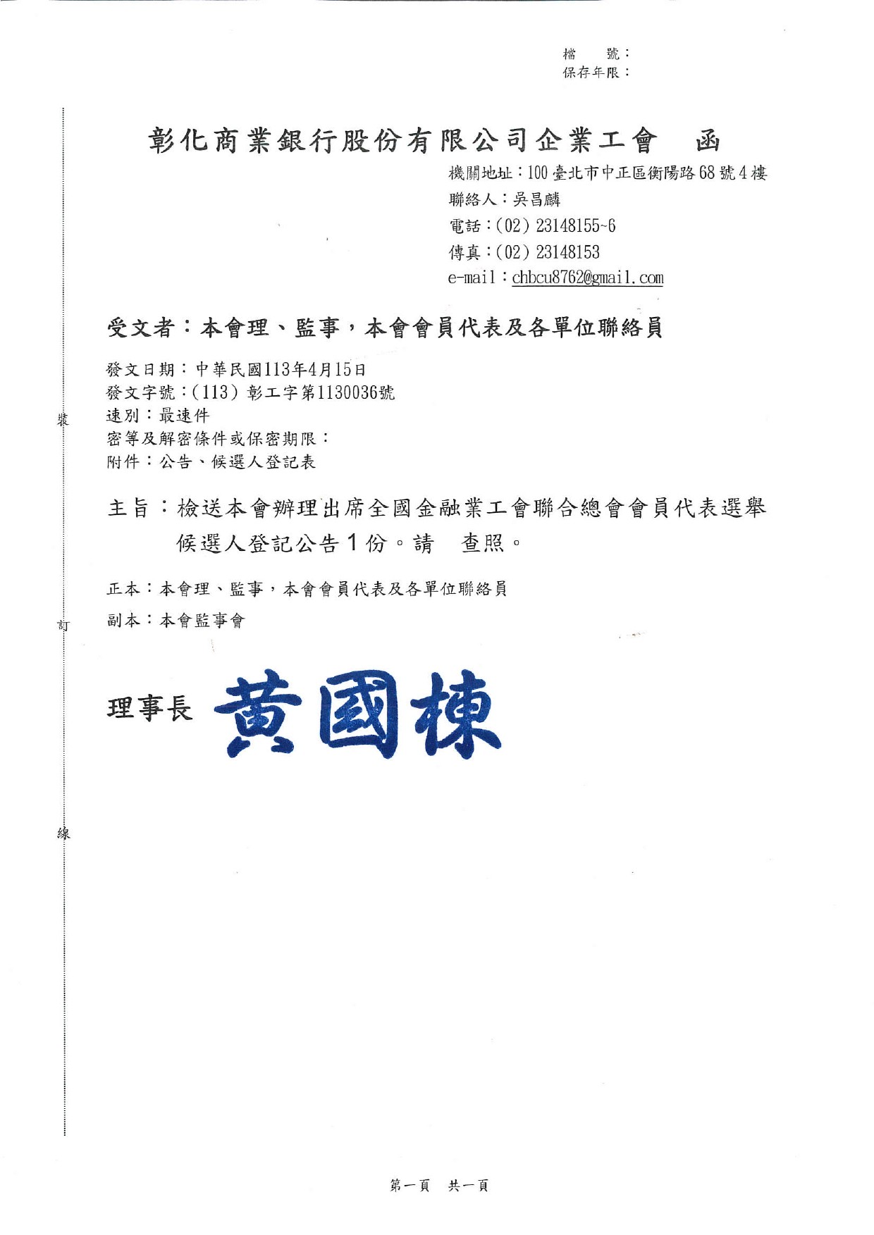 113.04.15彰銀工會公告--公告本會辦理出席全國金融業工會聯合總會會員代表選舉候選人登記。
