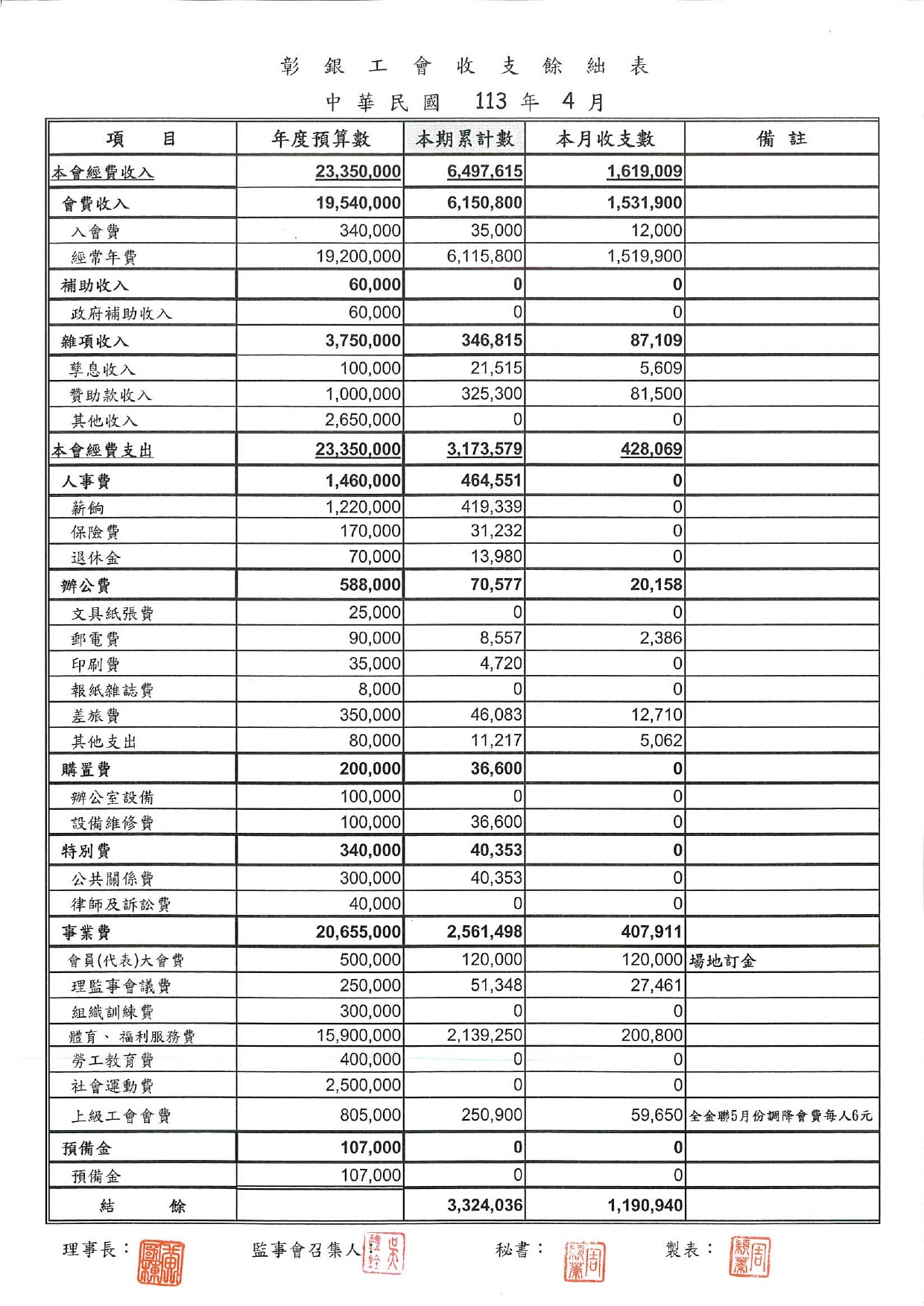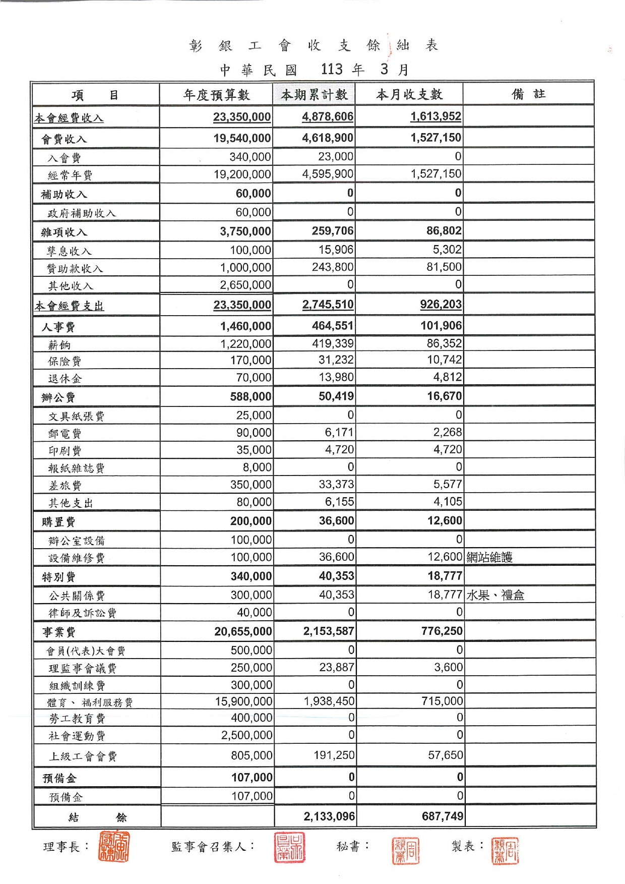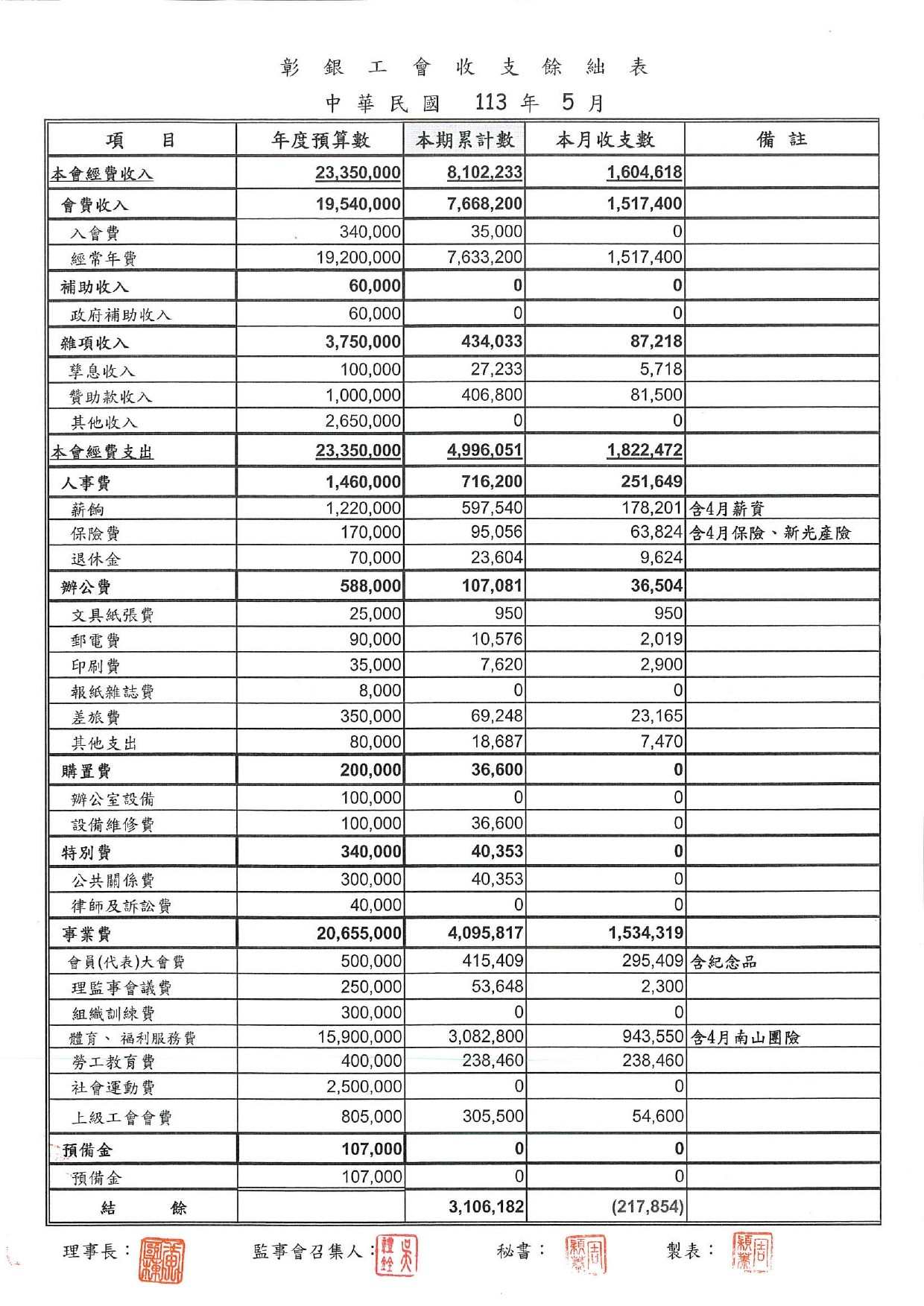 113年3月份至113年5月份收支餘絀表