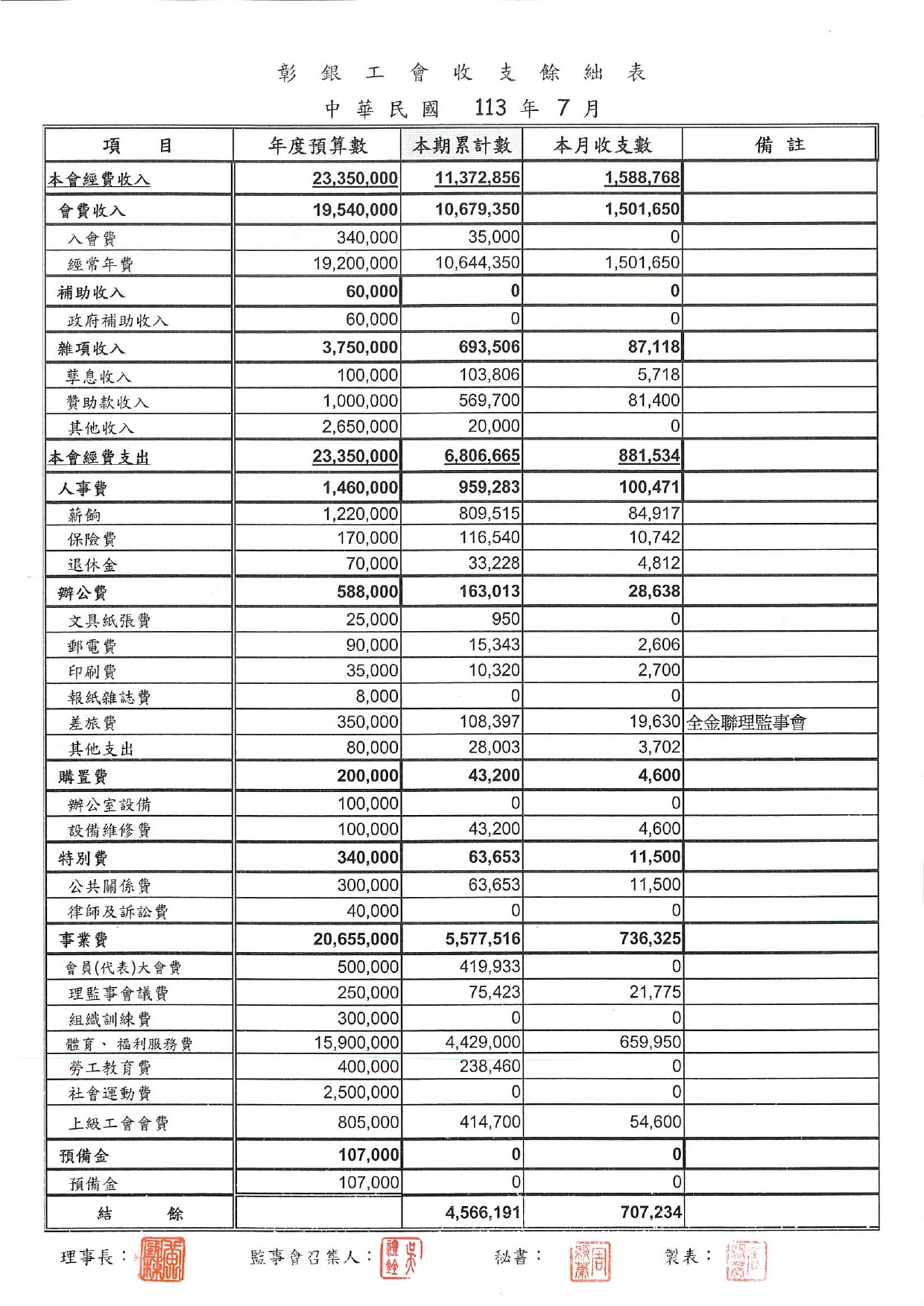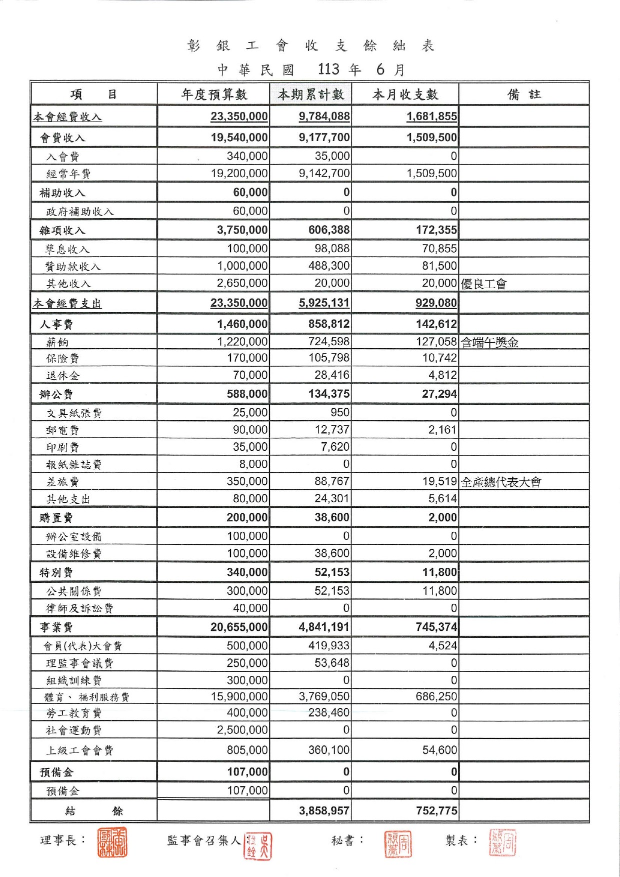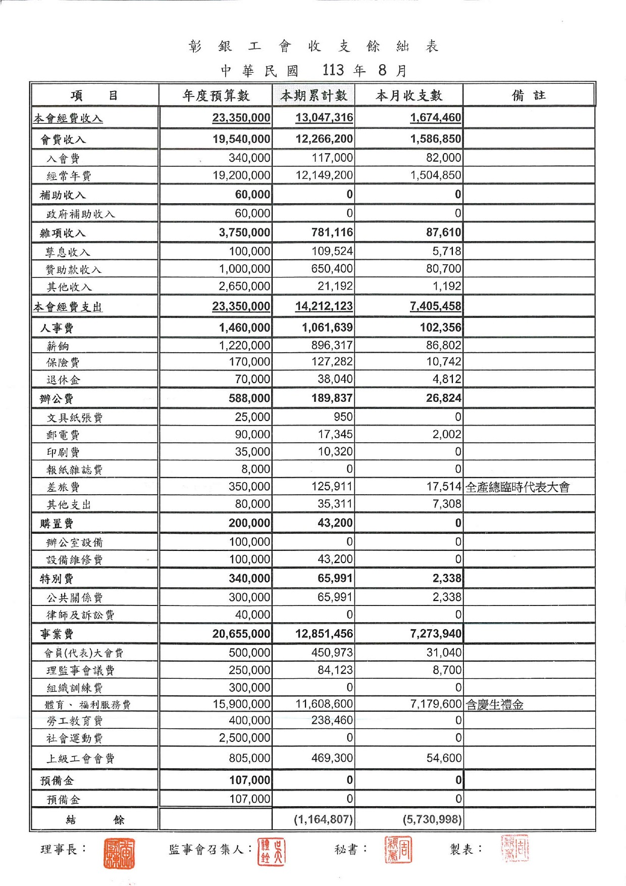 113年6月份至113年8月份收支餘絀表