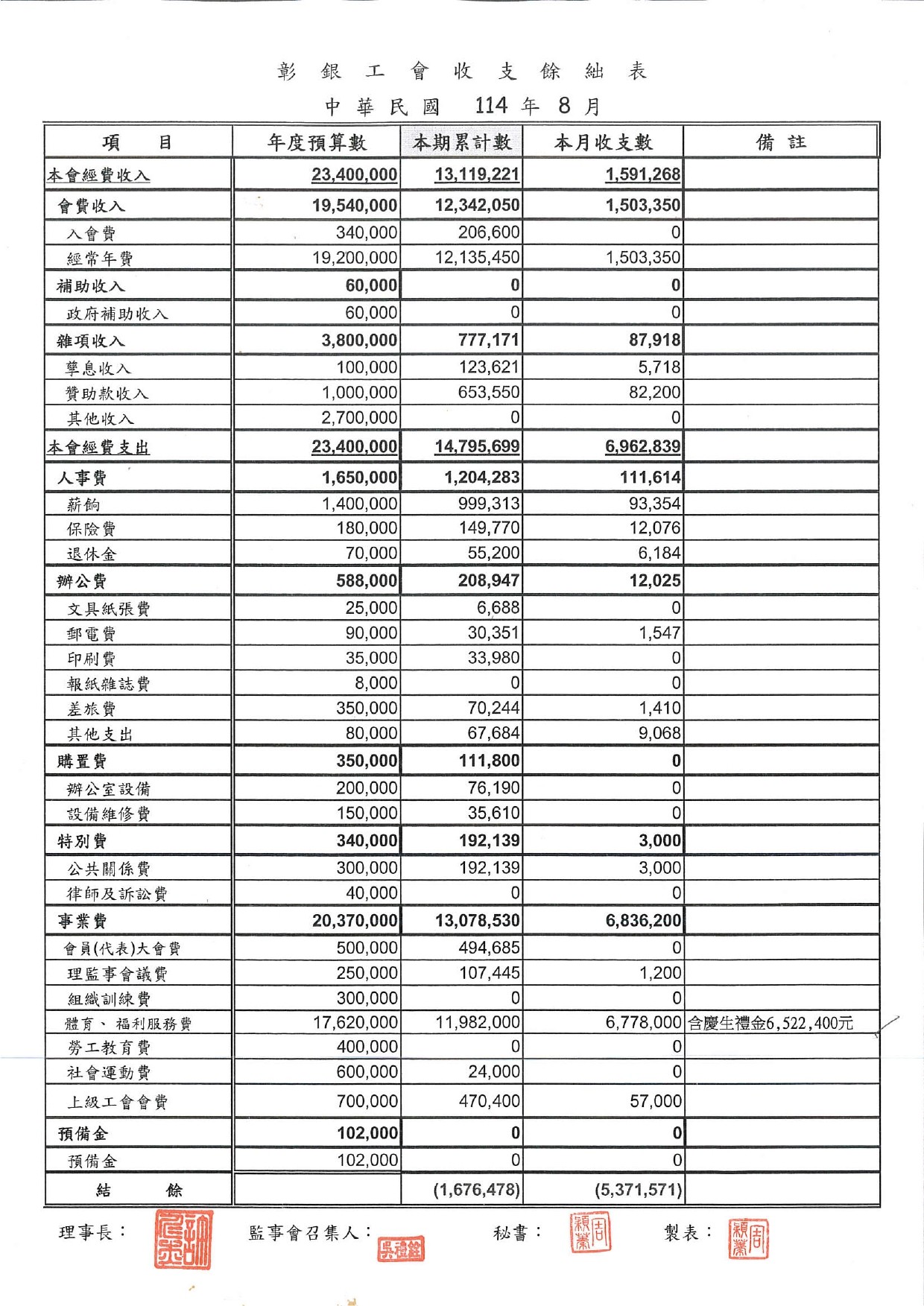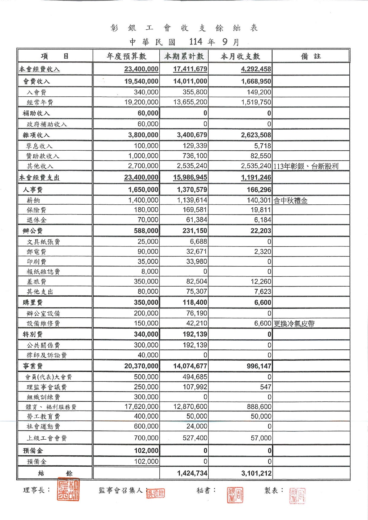 114年8月份至114年10月份收支餘絀表