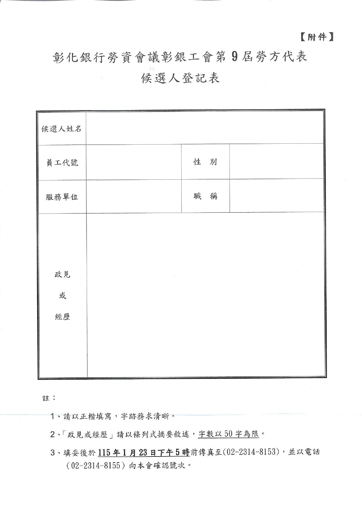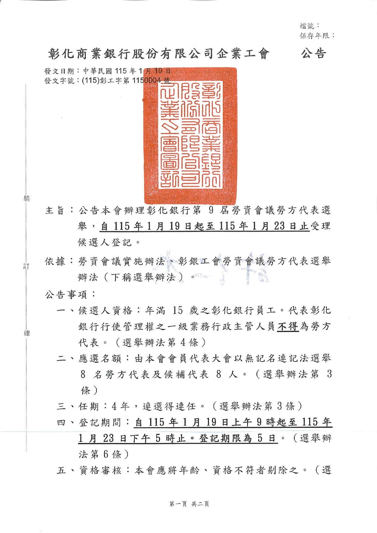 115.01.19彰銀工會公告--公告本會辦理彰化銀行第9屆勞資會議勞方代表選舉。
