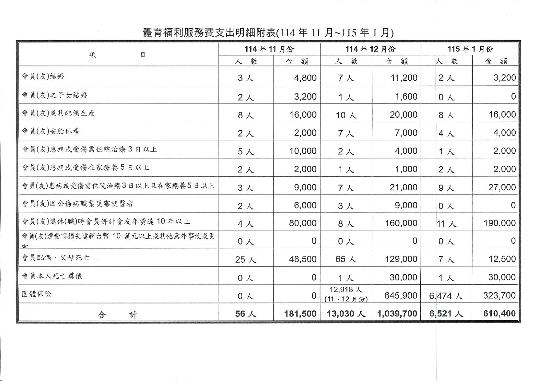114年11月份至115年1月份體育、福利服務費用支出明細表