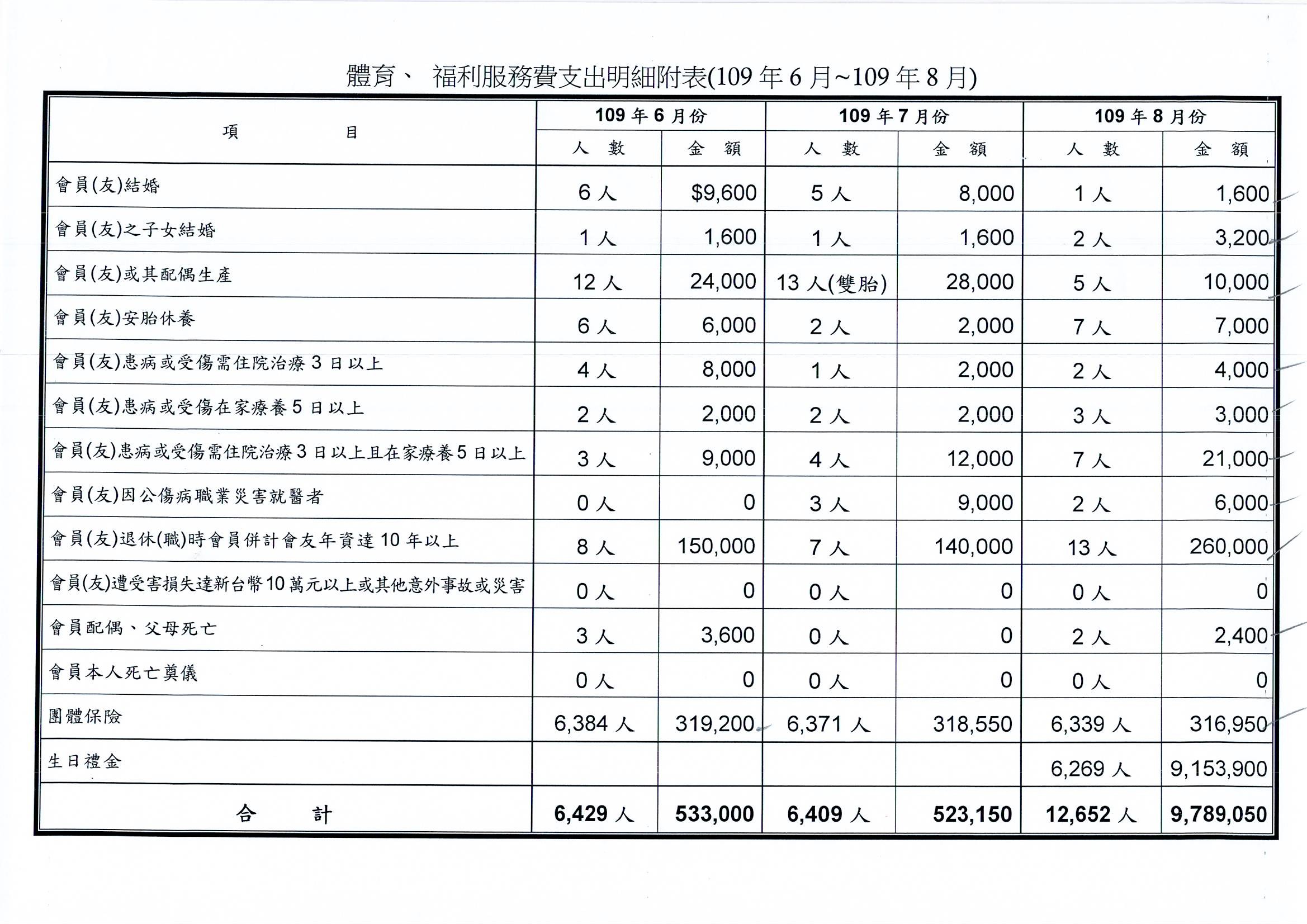 109年6、7、8月份體育、福利服務費用支出明細表