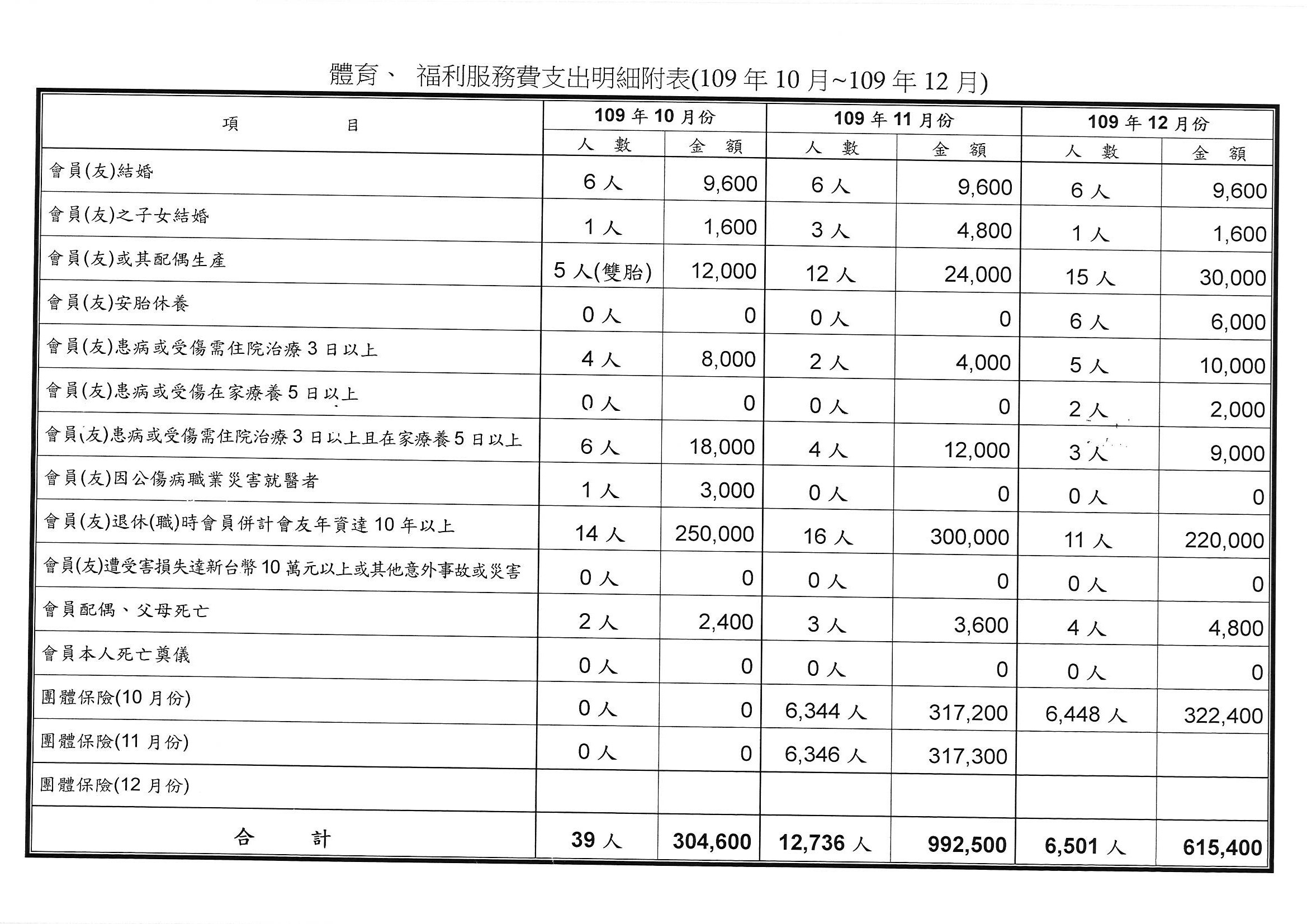 109年10、11、12月份體育、福利服務費用支出明細表